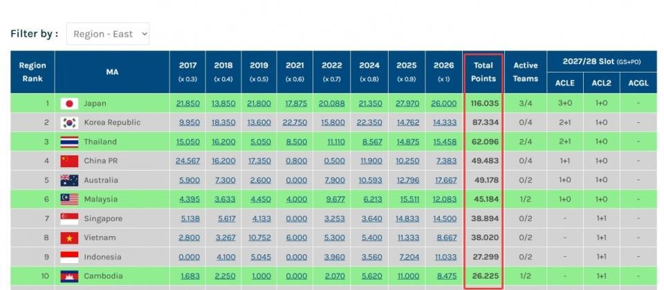 随着柴桢晋级亚洲挑战者联赛半决赛,中超本赛季亚冠技术积分已经被柬埔寨联赛超越,仅排名东亚第10名。